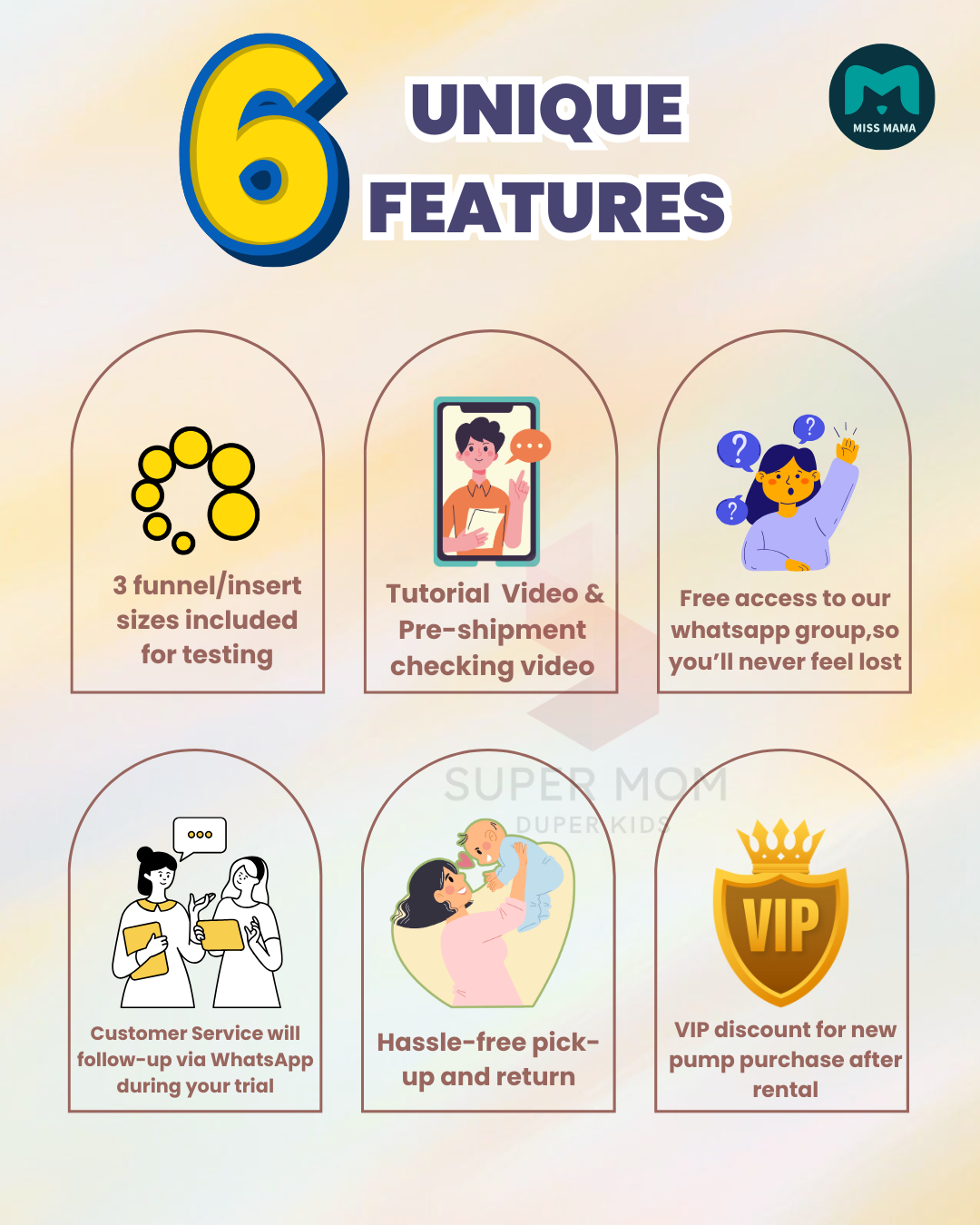 I have just delivered my 1st child hence I was very lost in choosing breast pump. I was so anxious and was thinking of purchasing a breast pump before delivery however rental service from super mom duper kids is the best solution that you can choose! with this service you can try out pumps after you deliver so that you wont buy the wrong pump that doesn't suits you. There will be a team to guide you to choose your pump from types/ flanges size/ inserts etc so you wont get overwhelmed. The delivery of pumps is fast as well and comes with various size of inserts so you will get to try and confirmed which one suits you the best. After you are satisfied you can always buy the pumps from them. Good service, will definitely recommend my friends.
